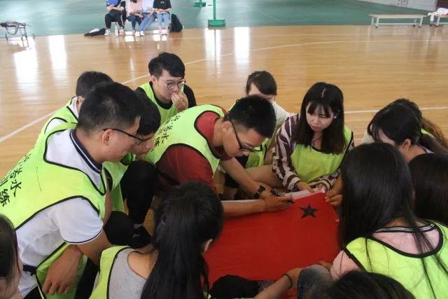 早上八点,全体成员在文体活动中心集合,与本次拓展教练见面,活动正式开始。教练向同学们介绍了训练目的与任务目标,并将同学们分成六个队伍,选出队长、秘书、旗手、安全官。各队讨论设计出队名、队歌、队徽及口号,进行团队展示。他们分别是星耀王者队、星火队、铁拳队及粉红豹队。